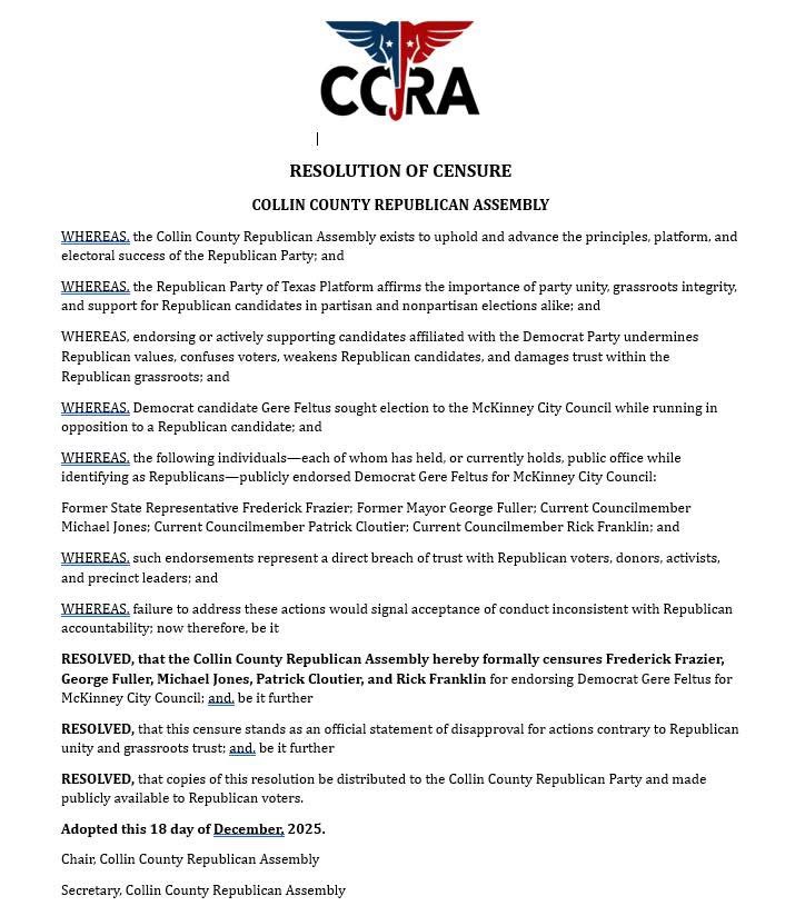 The censure resolution will be distributed to the Collin County Republican Party for further action to be taken.